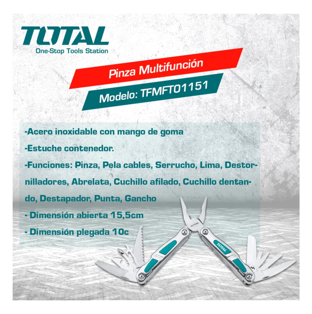 La multiherramienta Total TFMFT01151 es una solución versátil y compacta para trabajos de mantenimiento, reparación y uso general. Fabricada en acero inoxidable de alta resistencia, combina durabilidad con diseño ergonómico para un uso cómodo y seguro.